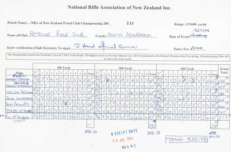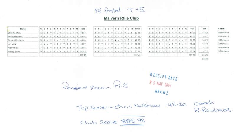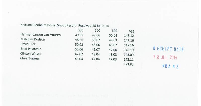 The 1 Aug cut-off date for the 2013/14 seasons club postal match results has just gone.  Three clubs lodged scores for this year’s competition:  Malvern, Kaituna Blenheim and Petone Rifle Clubs.